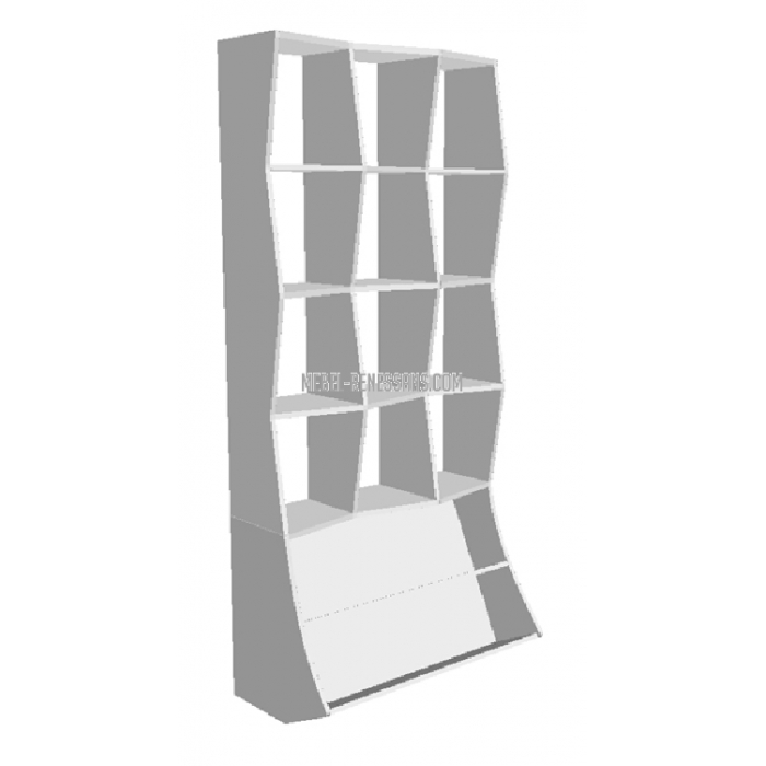 Розміри: 940х505х2055. Стелаж оснощений відкритими на нахиловими, виставковими, полицями. Має фігурні боковини та полиці. Колір ламінованого ДСП: Білий Текстурний (на вибір замовника).