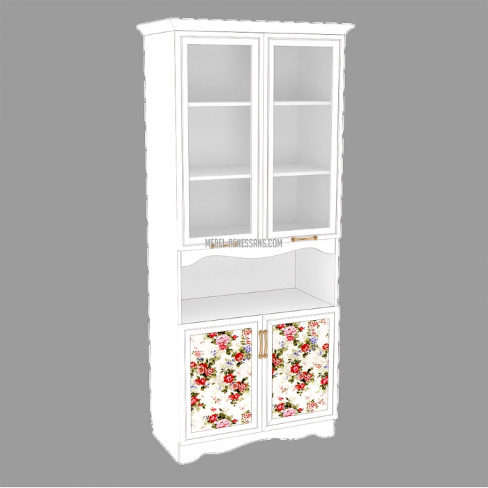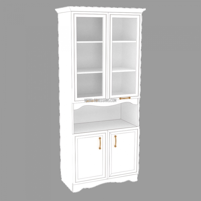 Складається з вітрини зі скляними фасадами (скло прозоре ) в профілі МДФ, нижньої секції та ніші меж ними. В скляній вітрині розташовано дві з`ємні полиці, в нижній - одна з`ємна полиця. Каркас виробу виготовлено з ЛДСП 18 мм. Задня стінка - ЛДВП. Фасади нижньої секції виготовлено з рамочного профілю МДФ (AGT – Туреччина) з наповненням ЛДСП 10 мм.