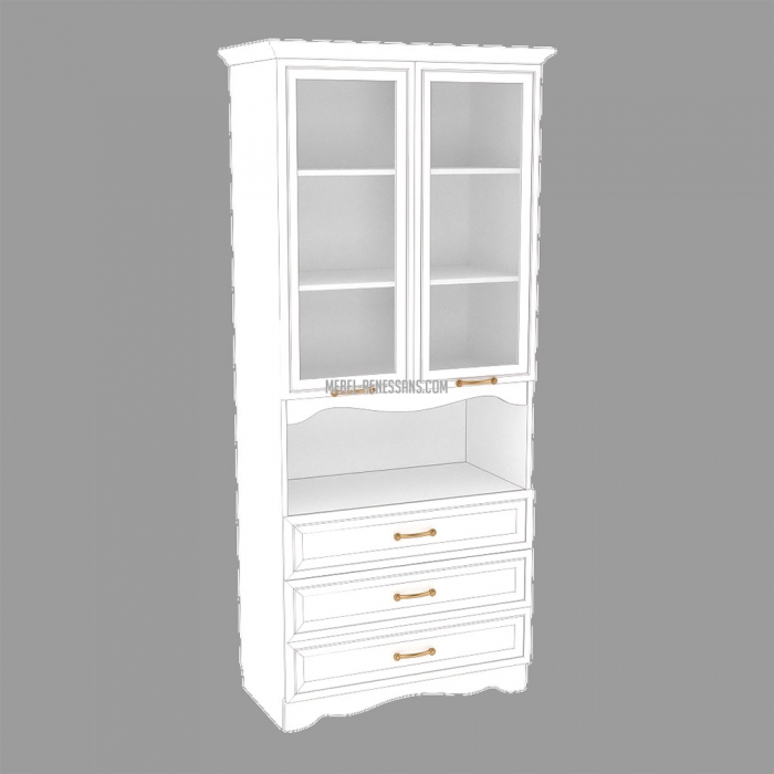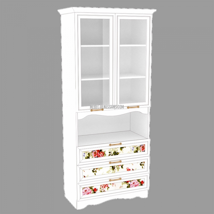 Має вітрину зі склями фасадами (скло прозоре) в профілі МДФ, три висувних шухляди на телескопічних направляючих та нішу меж ними. В скляній вітрині розташовано дві з`ємні полиці.